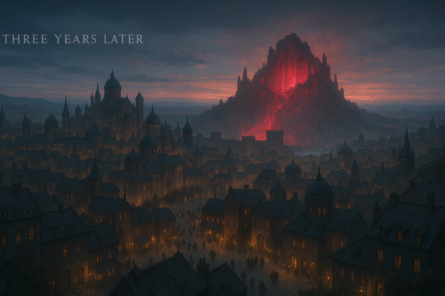 [AIFig-15: Rebuilt King's Landing with mysterious red lights emanating from Dragonpit ruins, three years later, ethereal atmosphere]