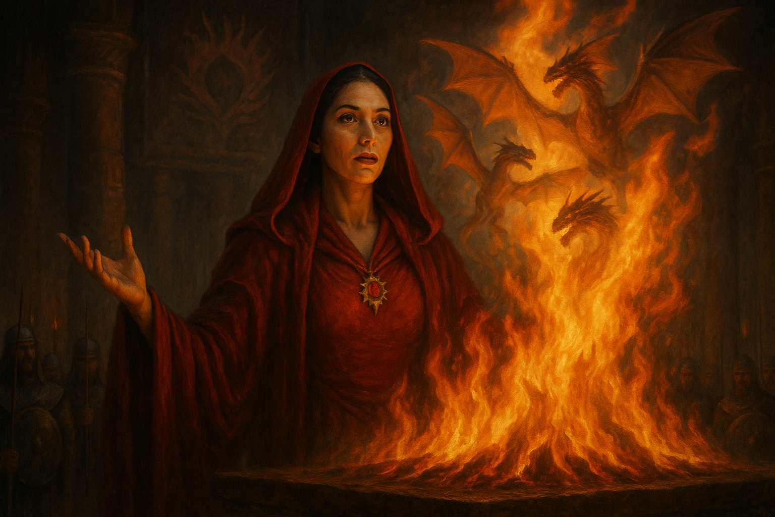 [AIFig-16: Kinvara in Volantis red temple, flames showing visions of three dragons, mystical prophecy scene]