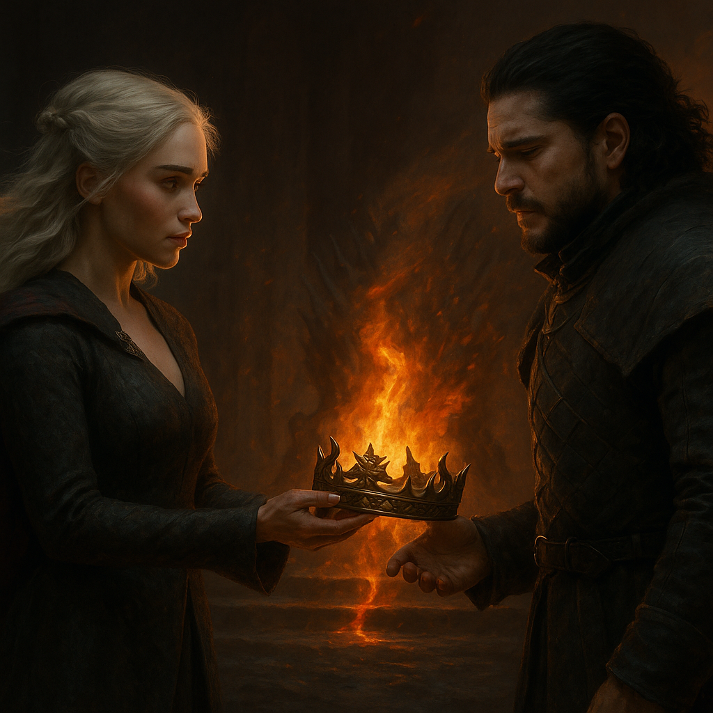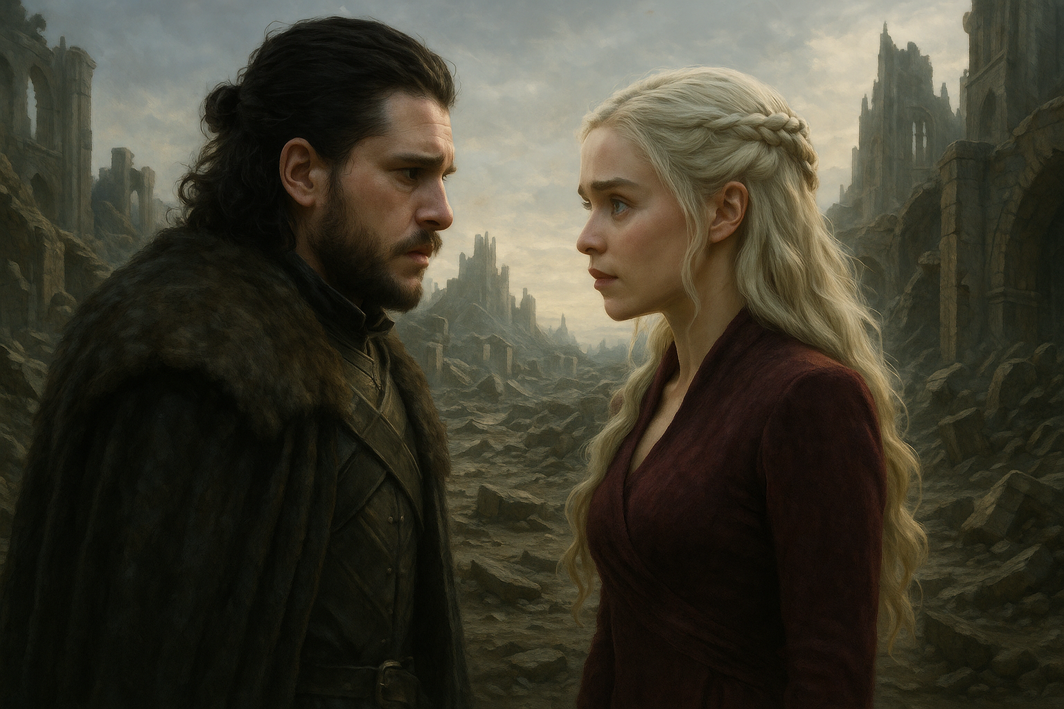 킹스 랜딩의 폐허를 걷는 두 사람: 그들은 함께 킹스 랜딩의 재건 현장을 걸었다. 데너리스는 자신이 불태운 집들, 죽인 무고한 사람들을 보며 괴로워했다. "나는 몬스터였다." 그녀가 말했다. 하지만 존은 그녀의 손을 잡으며 대답했다. "아니다. 당신은 고통받고 있었다. 우리 모두가 당신을 실망시켰다." 그들은 레드 킵의 폐허 앞에 서서 과거를 회상했다. "우리는 다시 시작할 수 있을까?" 데너리스가 물었다. "모르겠다. 하지만 시도해볼 수는 있다." 존이 대답했다.