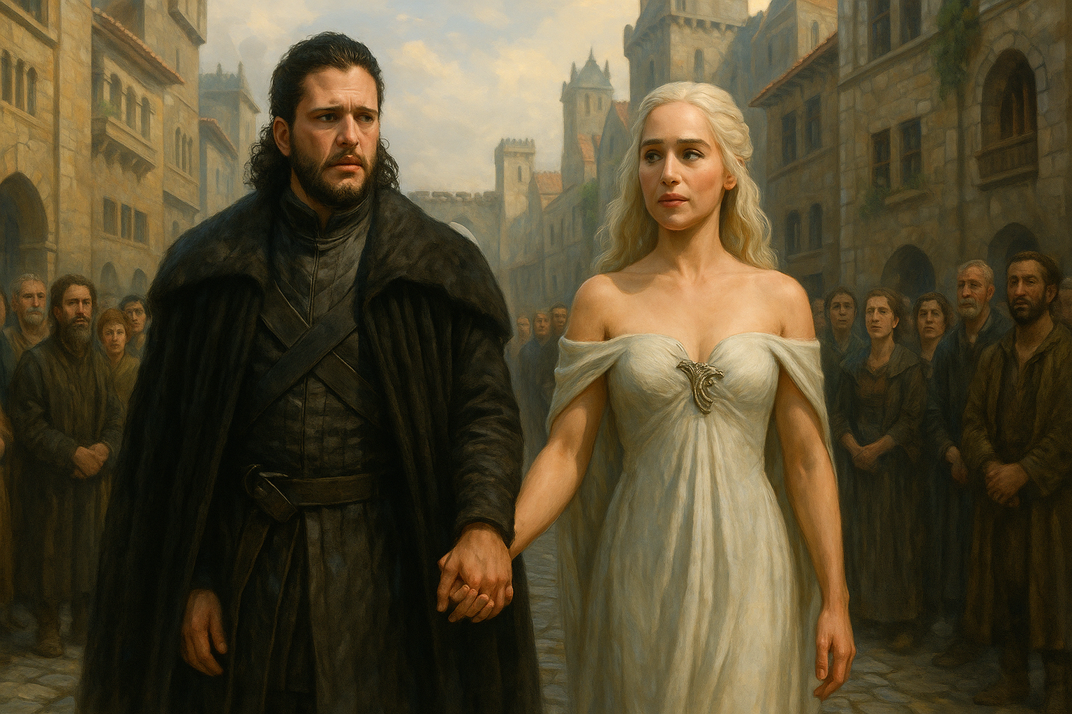[AIFig-31: Jon and Daenerys walking through rebuilt King's Landing, holding hands, people watching with mixed emotions]