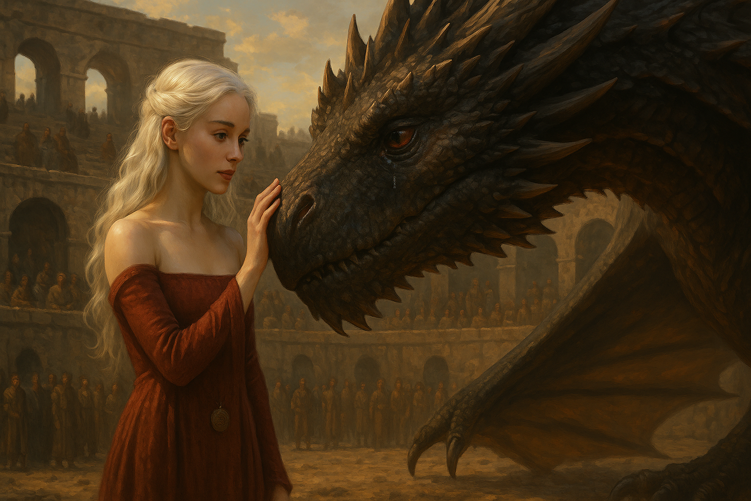 [AIFig-20: Ellaria touching Drogon's head in ancient Volantis arena, emotional connection between them, tears in dragon's eyes]