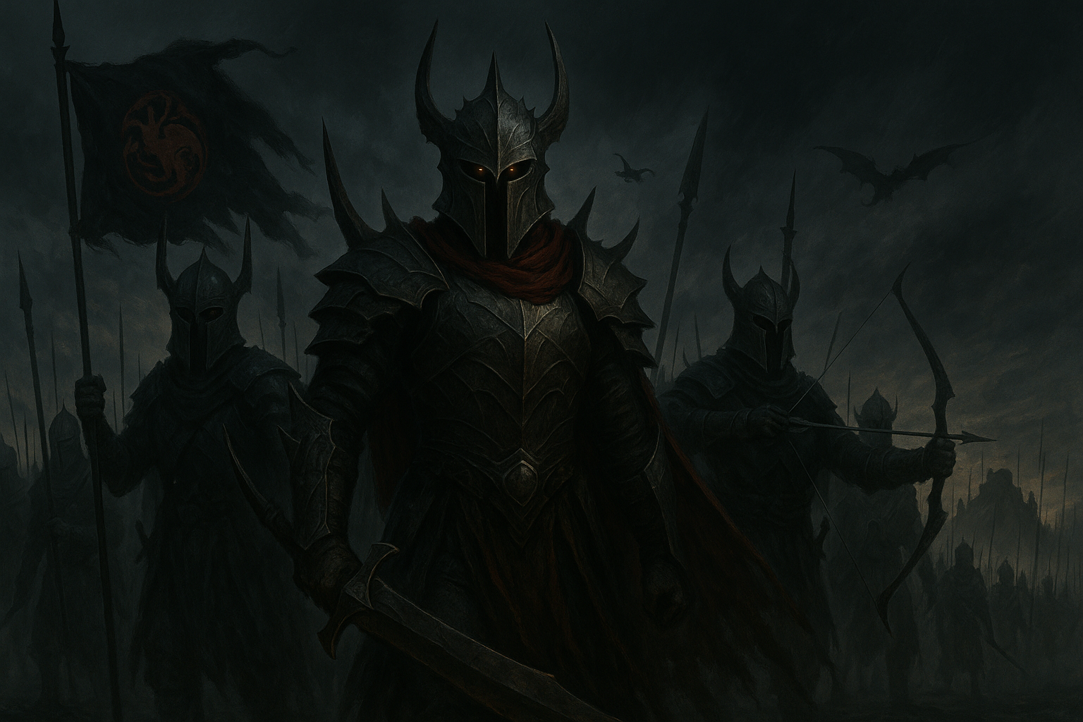 [AIFig-32: Mysterious eastern invaders with strange armor and weapons, threatening Westeros, dark army approaching]