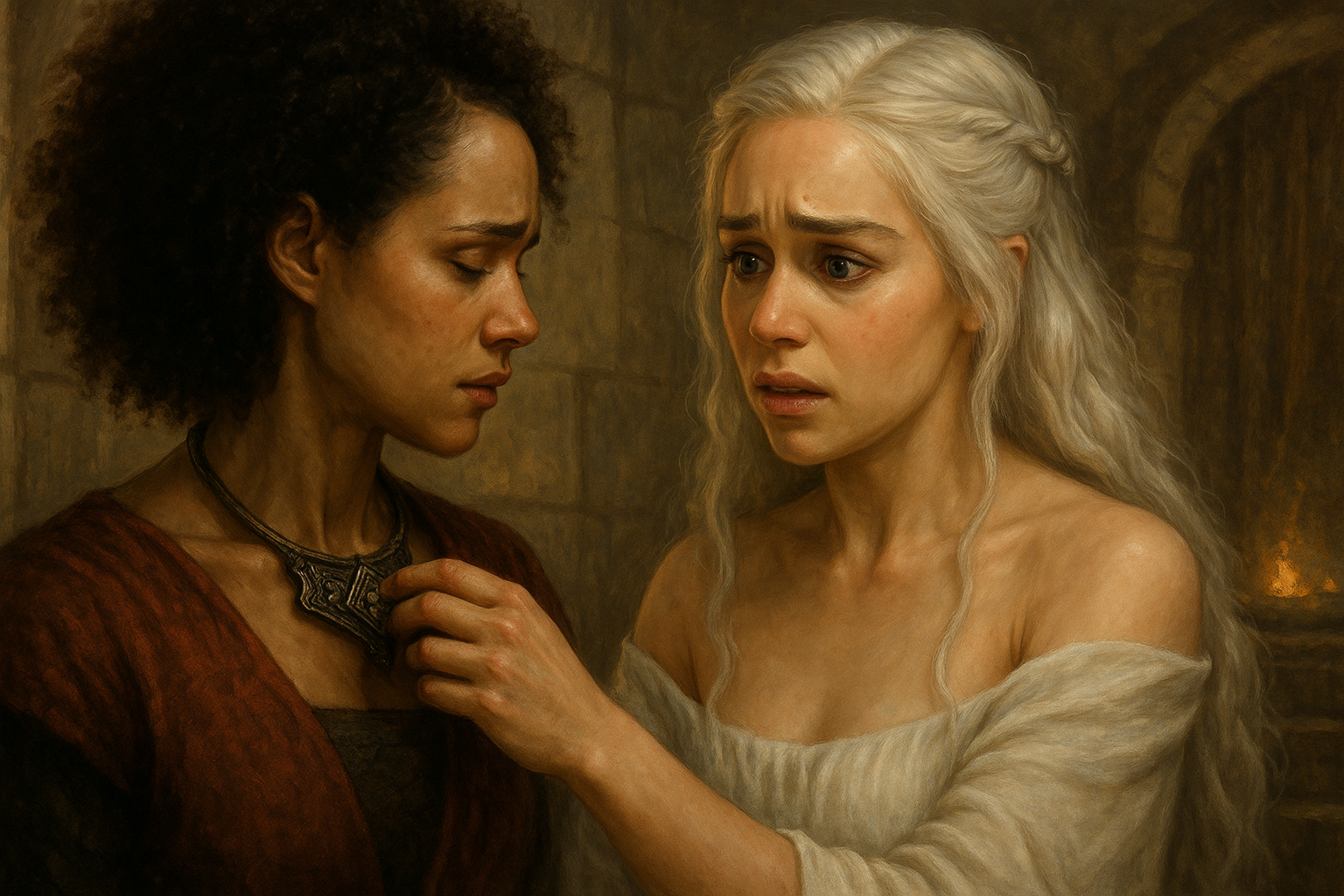 [AIFig-28: Daenerys with lost memories, touching Missandei's collar with confused expression, emotional rediscovery scene]