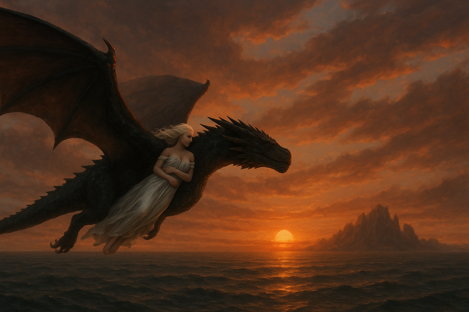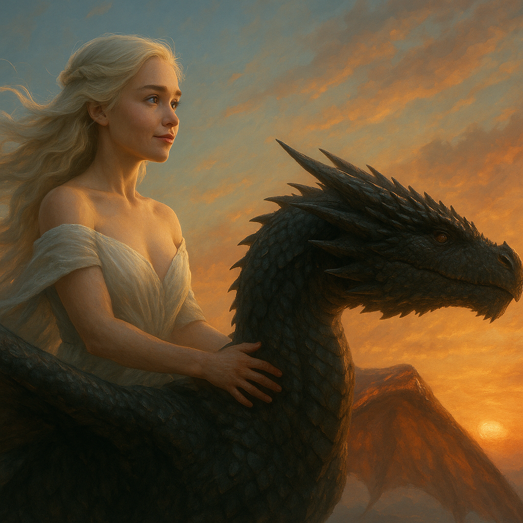드래곤스톤의 절벽에서 데너리스는 바람에 은발을 날리며 깊은 사색에 잠겼다. "나는 정복자였다가 파괴자가 되었다. 이제 구원자가 될 수 있을까?" 드로곤이 그녀 곁으로 다가와 거대한 머리를 그녀 어깨에 기댔다. 그 순간 그녀는 결심했다.