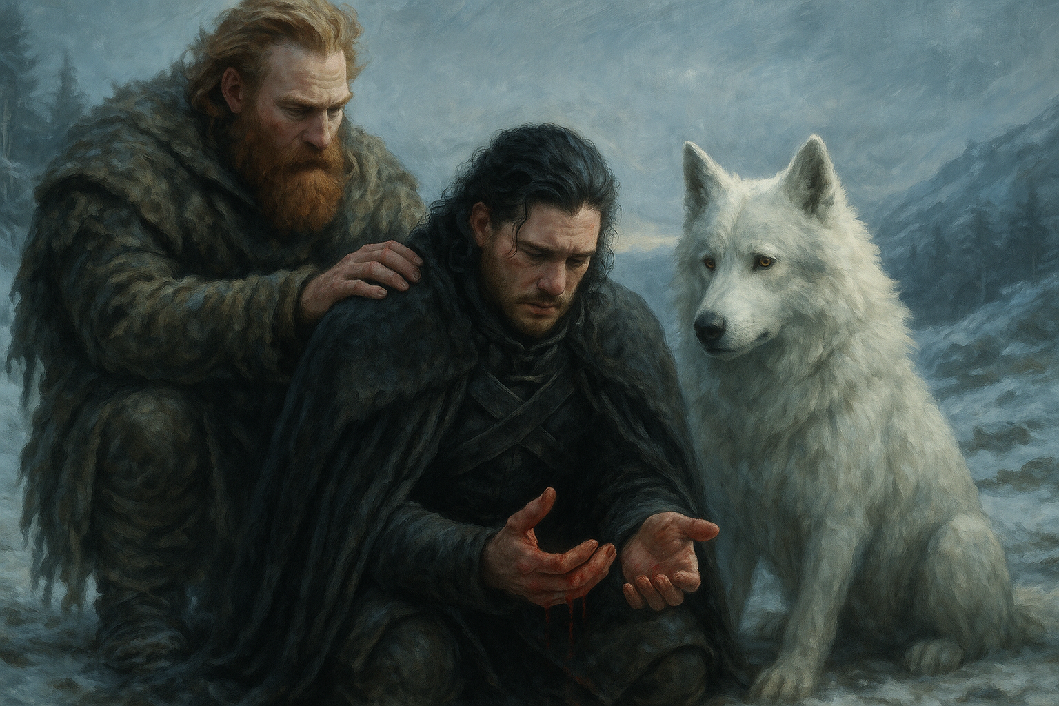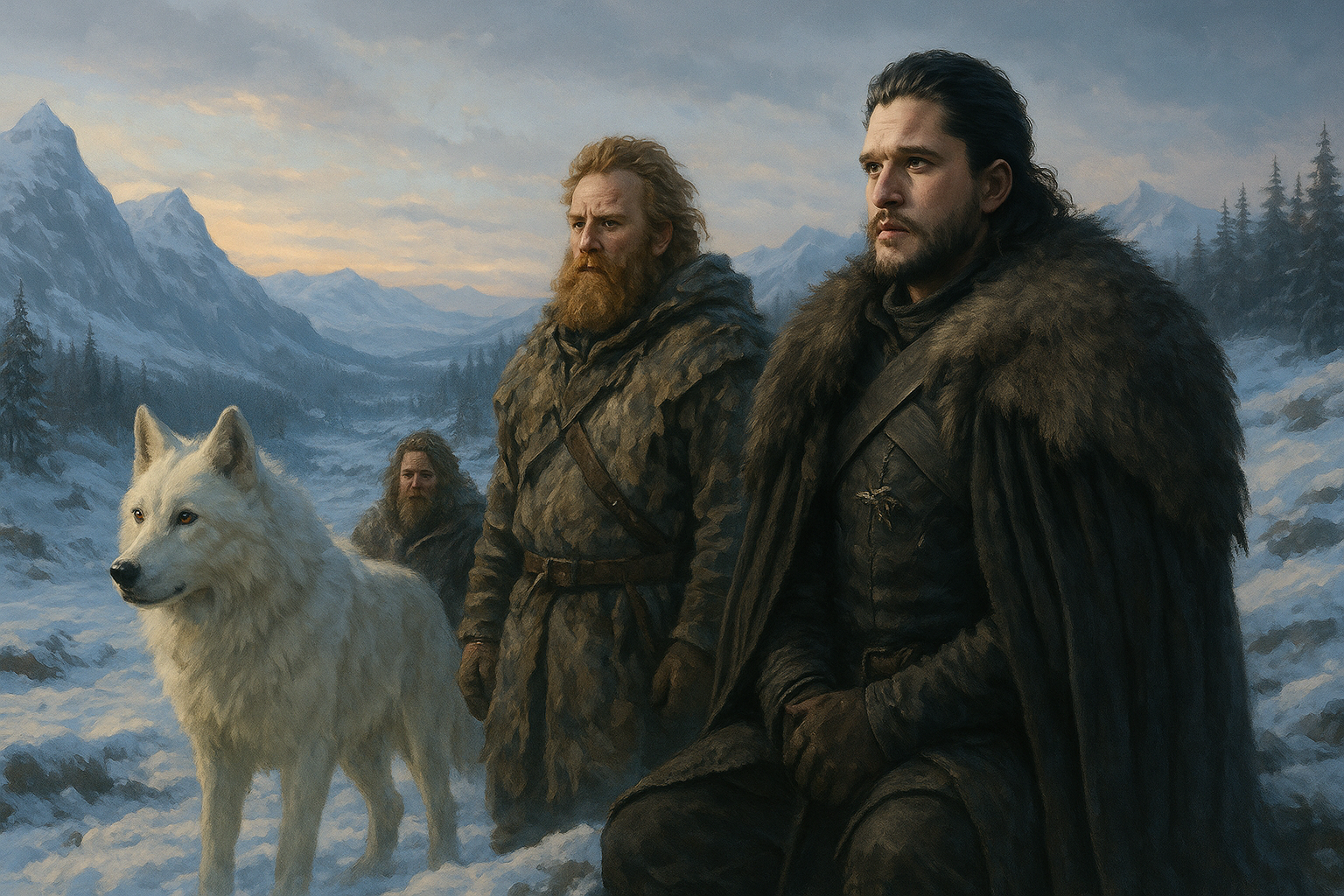 [AIFig-24: Jon Snow beyond the Wall with Tormund and Ghost, northern wilderness, contemplative mood]
