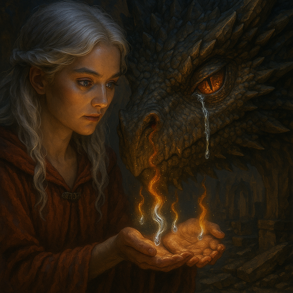 [AIFig-23: Ellaria collecting magical silver tears from Drogon's eyes, tears turning into small flames, mystical scene]
