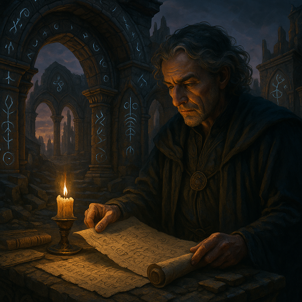 [AIFig-22: Ancient Valyrian ruins with mystical symbols, Koraxon studying ancient scrolls by candlelight, magical atmosphere]