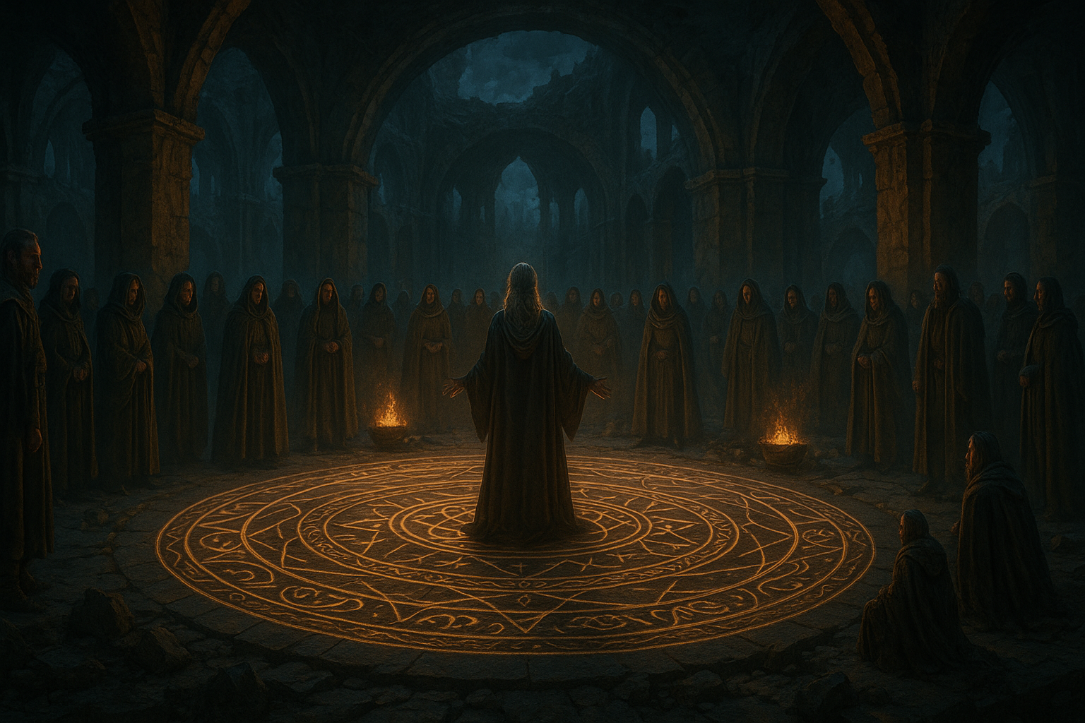 [AIFig-26: Dragonpit restoration with ancient Valyrian magical circle, all participants gathered for the ritual, dramatic lighting]