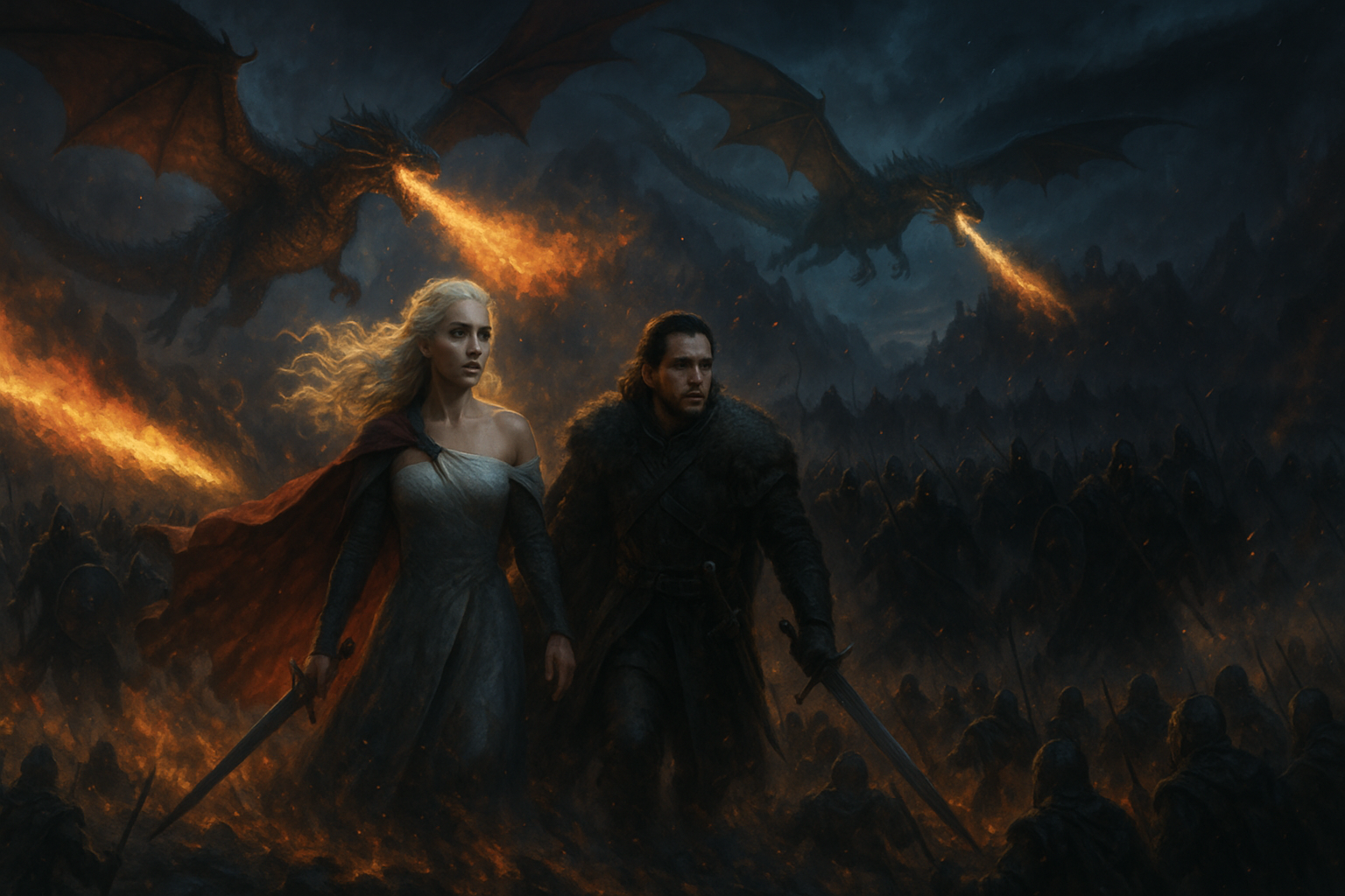 [AIFig-34: Epic battle scene with Daenerys and Jon leading united forces against shadow army, dragons breathing fire against darkness]