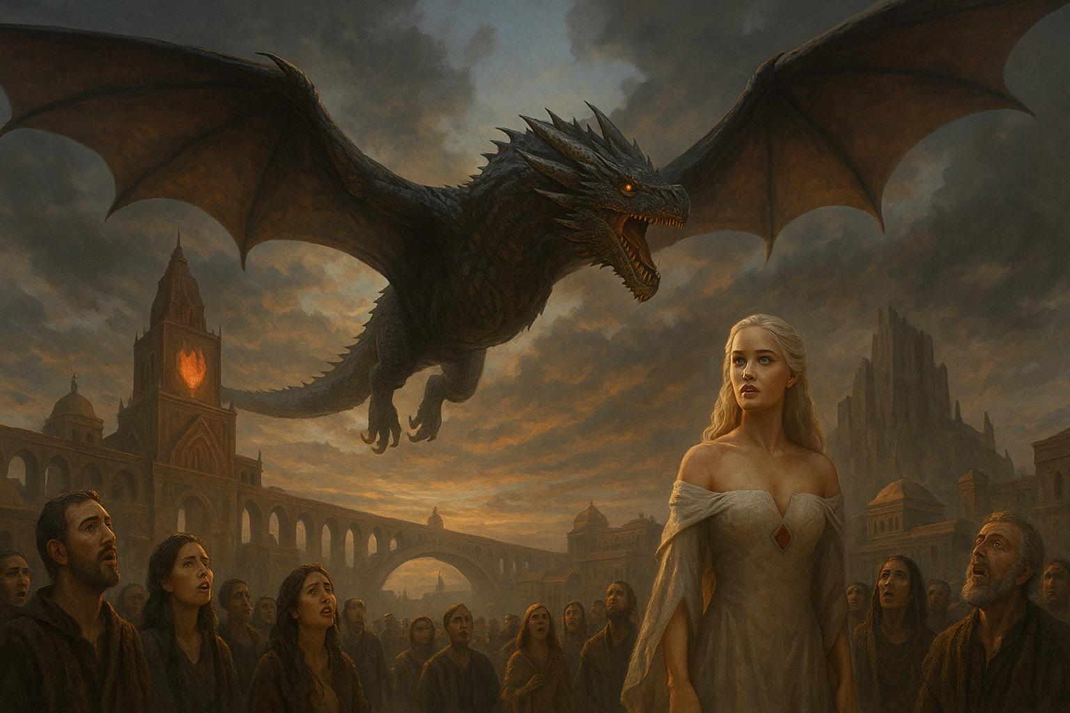 [AIFig-19: Massive grown Drogon flying over Volantis, people looking up in awe and fear, dramatic sky background]