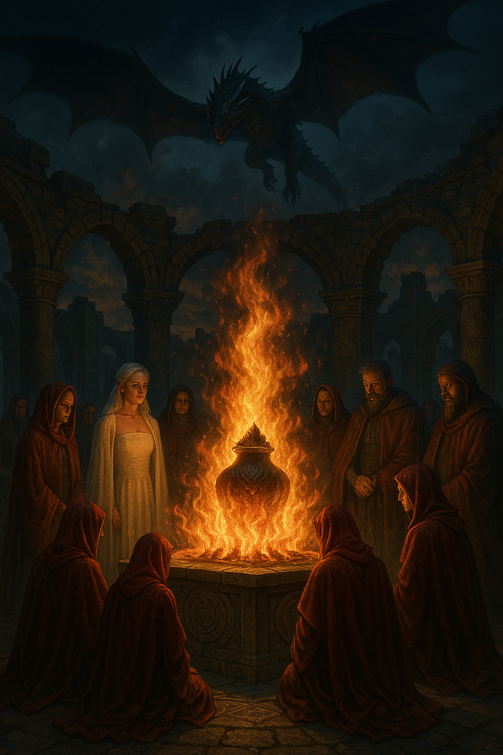 [AIFig-27: Resurrection ritual in progress, magical flames surrounding Daenerys's ashes, all participants in ceremonial positions, Drogon breathing fire]