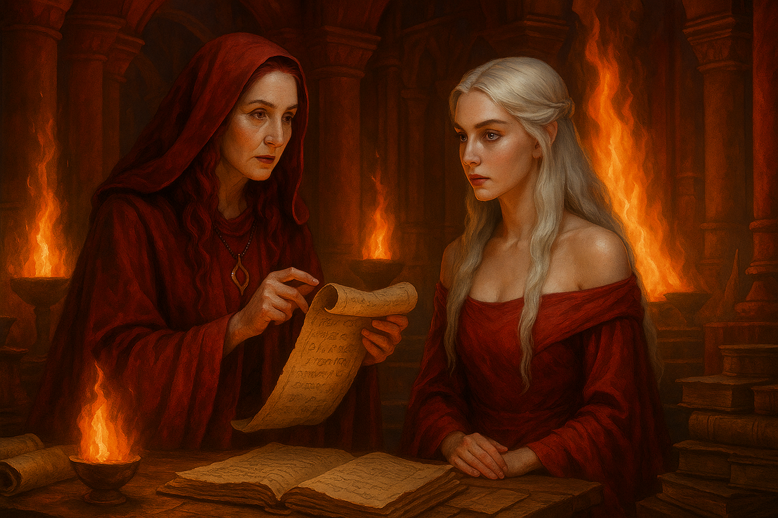 [AIFig-18: Kinvara giving sacred mission to Ellaria, red temple interior, flames and ancient prophecy scrolls]
