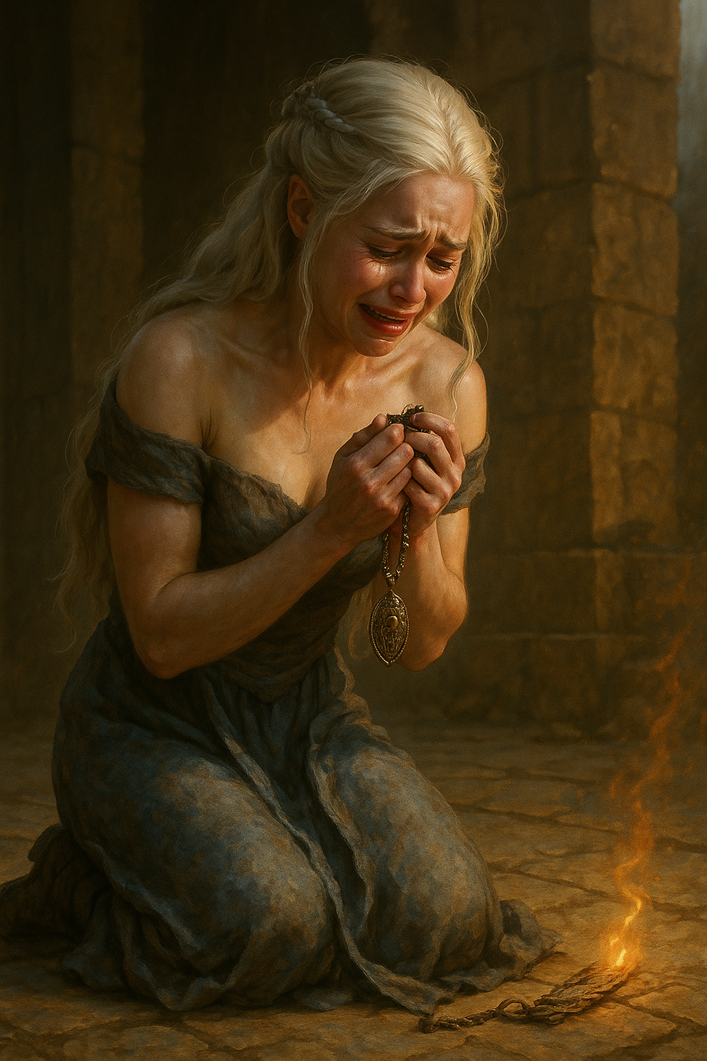 [AIFig-29: Daenerys kneeling and crying while holding Missandei's necklace, first memory returning, emotional breakdown]