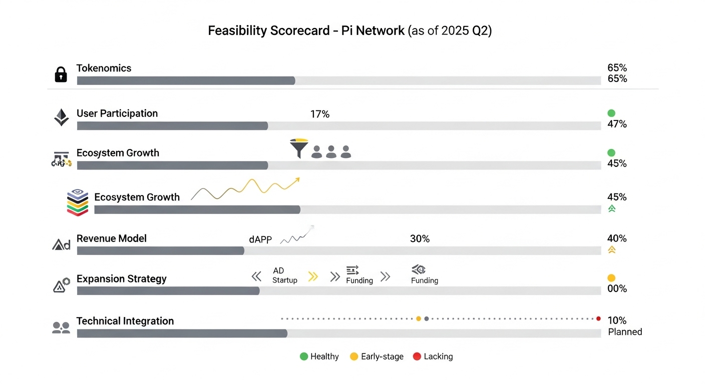Pi Network의 실행 가능성은 단순 사용자 수나 화제성보다는, 실제로 작동하는 경제 시스템과 기술 인프라, 외부 수용성 확보라는 6개 핵심 축을 기준으로 분석할 수 있습니다. 아래는 이들 축별로 진행 수준을 수치화한 KPI 기반 평가입니다.